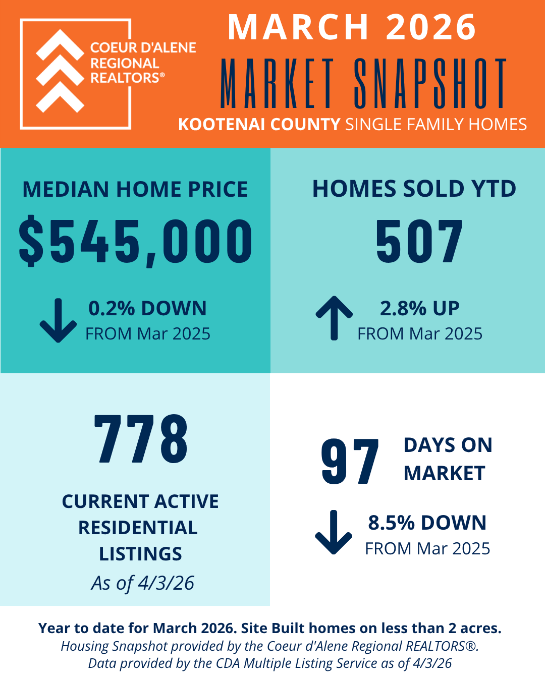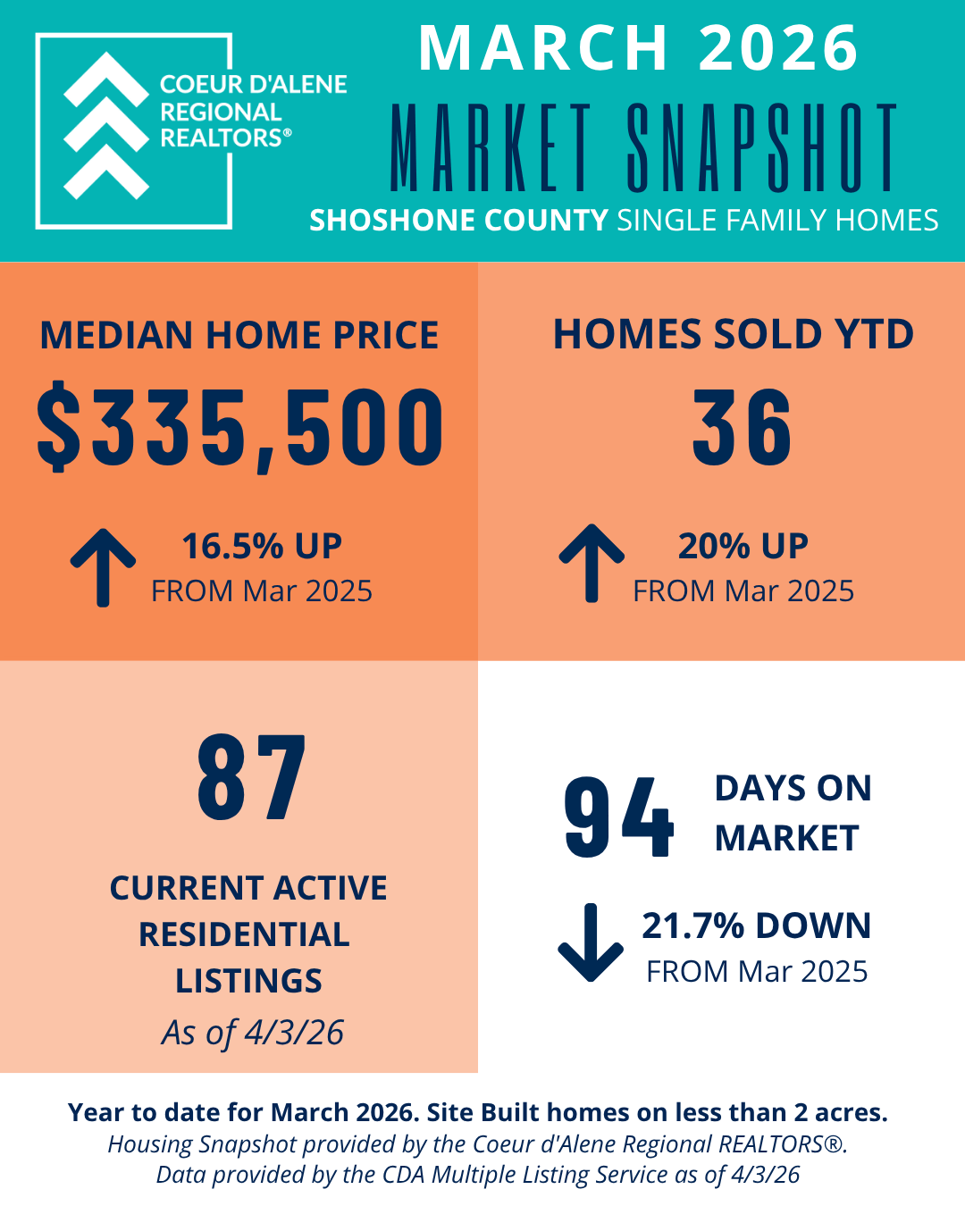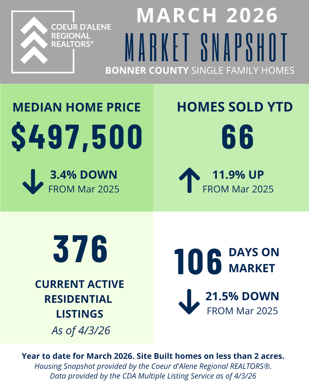 The Market Snapshot is a monthly insight on housing statics in local residential markets and are provided by the Coeur d'Alene Regional REALTORS® to share easily with consumers and members.