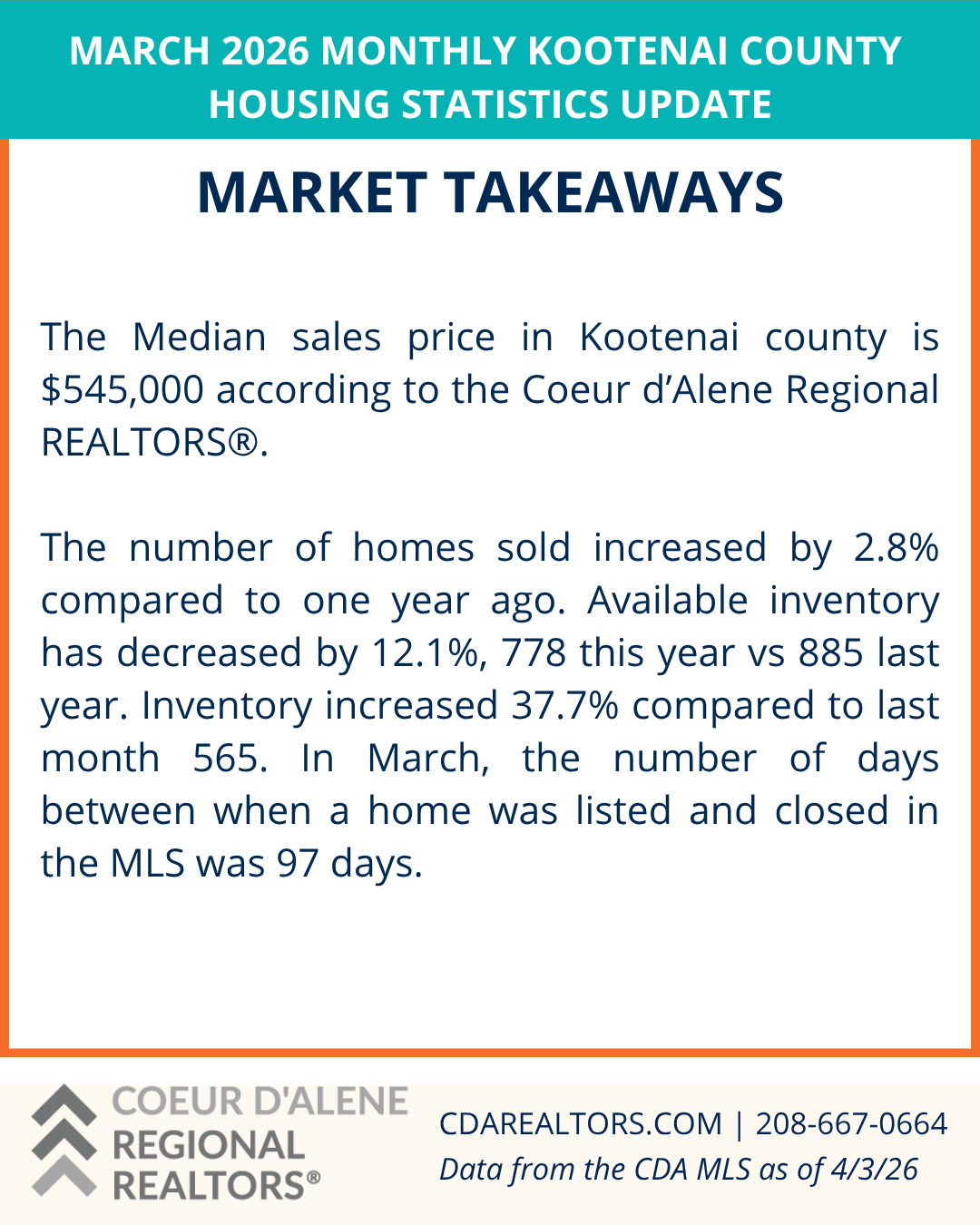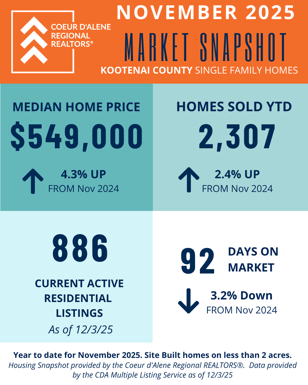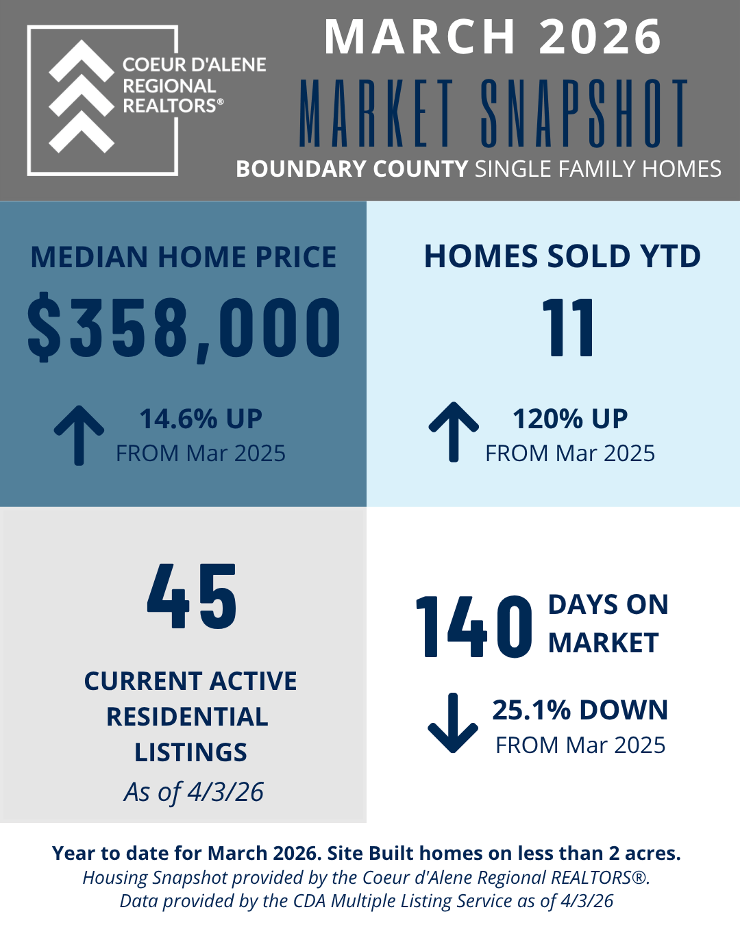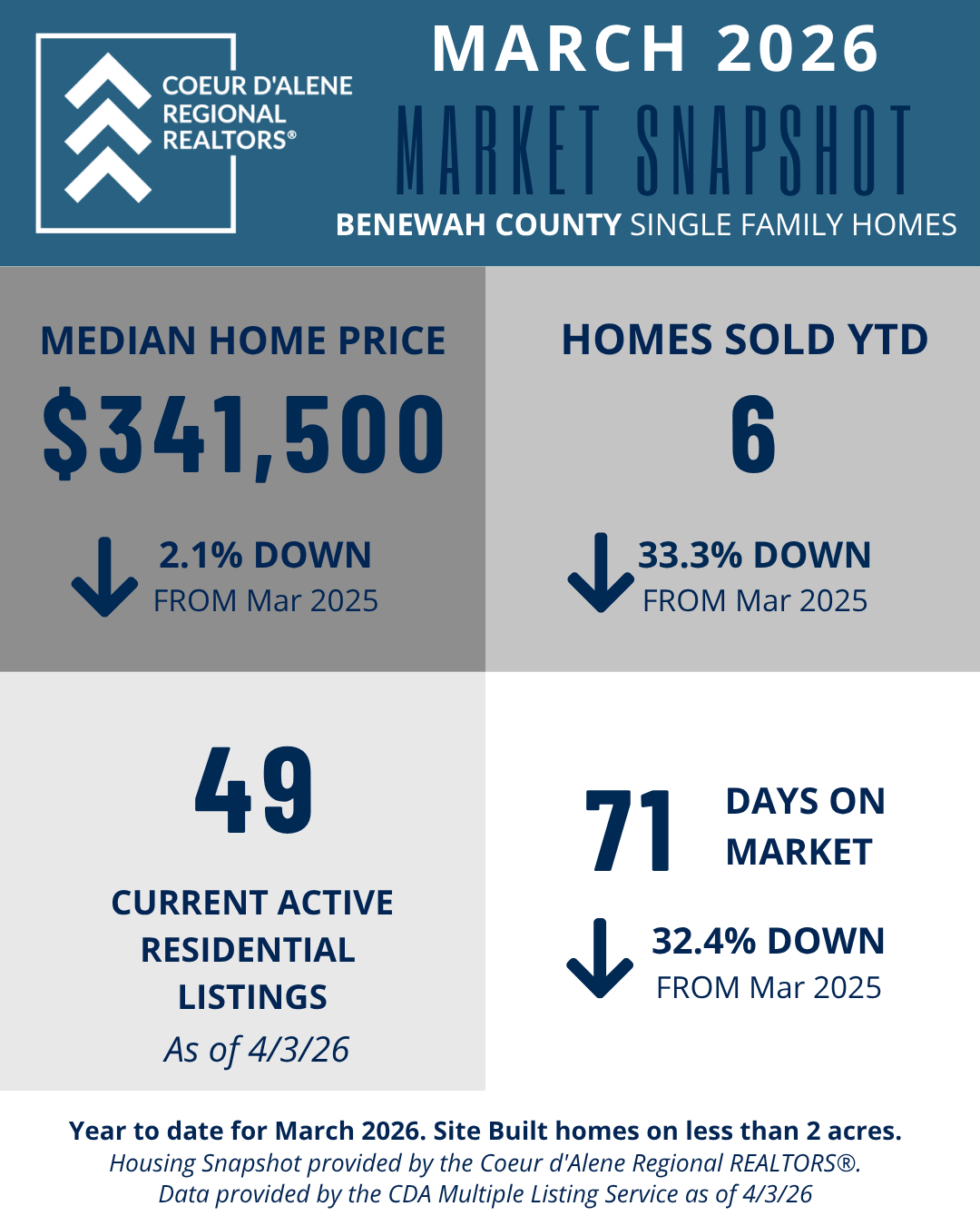 The Market Snapshot is a monthly insight on housing statics in local residential markets and are provided by the Coeur d'Alene Regional REALTORS® to share easily with consumers and members.